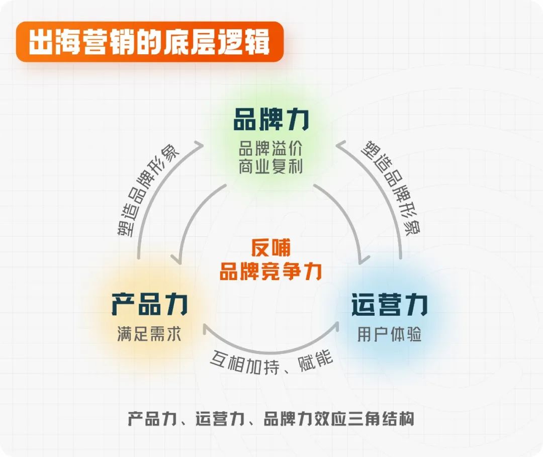其实,这“三力”也是品牌出海的底层逻辑,需要通过产品和运营来共同塑造品牌形象,再以品牌形象反哺产品和运营,这是一个收割业务的效应三角结构。也就是说,三者相辅相成,互相成就。